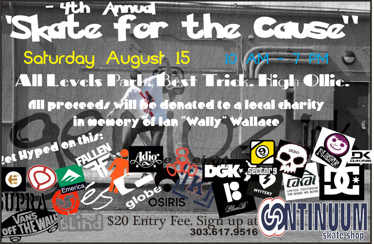 All levels park, best trick, high ollie. All proceeds will be donated to a local charity in memory of Ian "Wally" Wallace. $20 entry fee, sign up at Continuum Skate Shop or by calling (303) 617-9516.